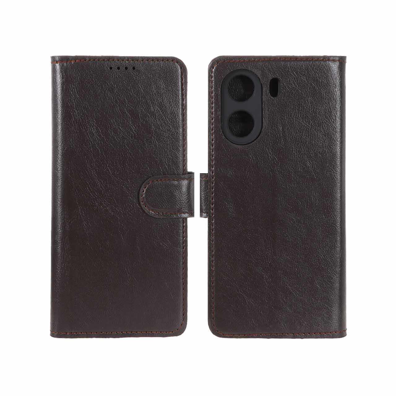 کیف موبایل چرمی مگنتی محافظ لنزدار Xiaomi Redmi 13C / Poco C65 - قهوه ای تیره
